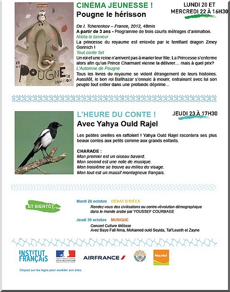 IFM - Parce que nous pensons que la culture est un bonheur contagieux qu'il nous incombe de répandre, l’IFM prend des couleurs et il y en aura pour tous les goûts et tous les publics ! Cette semaine : exposition, cinéma, médiathèque, conte… et bientôt conférence, musique, cirque et danse !!!
