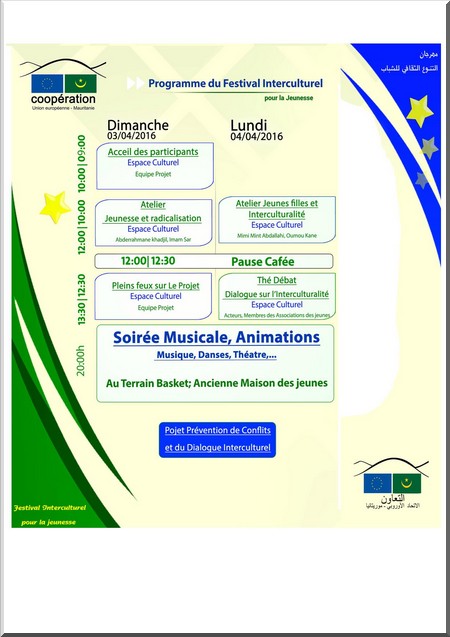 Espace Culturel - Le Projet Prévention de Conflits et du Dialogue Interculturel, organise le festival Interculturel pour la jeunesse les 03 et 04 avril prochain à Nouakchott.