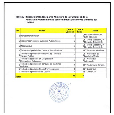 Ministère de l’Emploi - Dans le cadre de la coopération entre le Ministère de l’Emploi et de la Formation Professionnelle et l’Office de la Formation Professionnelle et de la Promotion du Travail (OFPPT) marocain, 30 places d’études pour une formation de Brevet de Techniciens Supérieur (BTS) dans les établissements de formation au Maroc sont prévues pour des spécialités demandées par les besoins de l’économie nationales, non disponibles dans notre offre de formation et jugées prioritaire par le département.